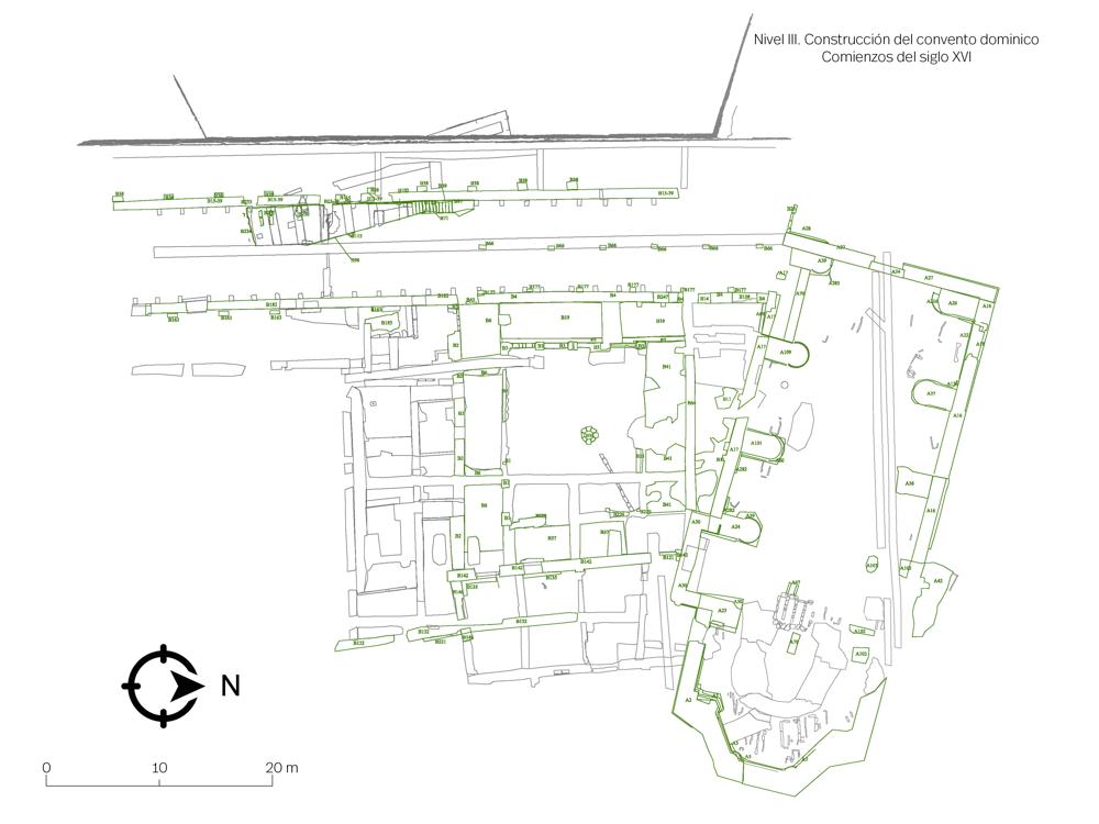 - Nivel III. Construcción del convento dominico a comienzos del siglo XVI. Instalaciones conventuales canónicas de una orden mendicante: iglesia, necrópolis interior, portería, claustro, sala capitular, refectorio, torre, cilla y bodega.